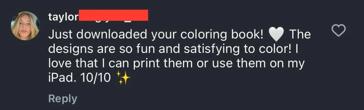 "Your coloring book is everything I needed and more! I’ve been using my iPad to color the pages, and it’s such a fun way to relax without needing to drag out all my supplies. Your designs are gorgeous, and they make me smile every time."