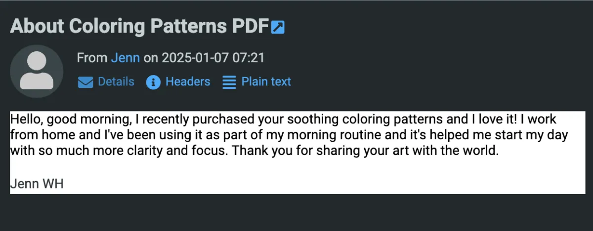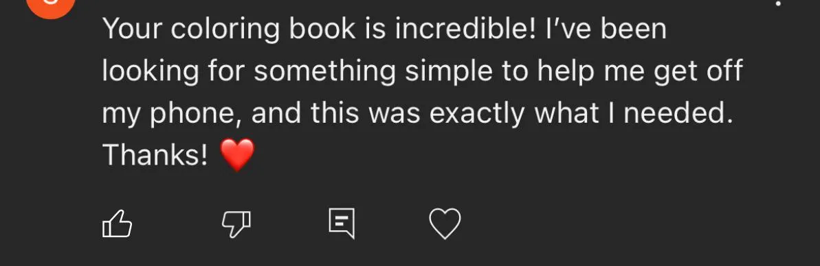 "I’ve tried so many ways to de-stress, but your coloring book is hands down my favorite. The patterns are the perfect balance of playful and soothing. I’m not an artist, but your designs make me feel creative without any pressure. Love it!"