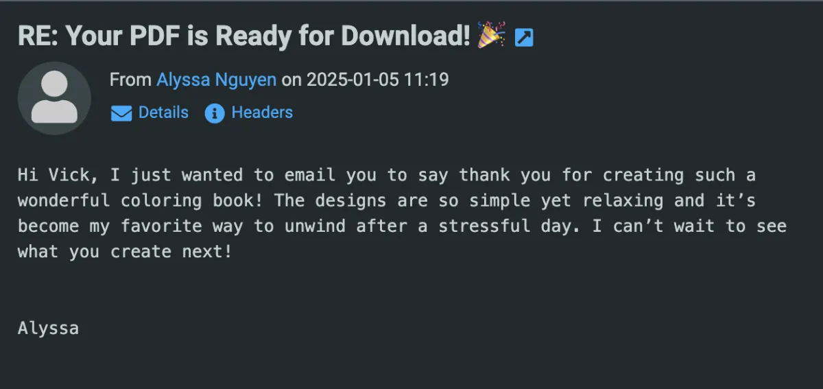 "Your designs are absolutely beautiful! I printed a few pages to color with my friends, and it was such a relaxing experience for both of us. It’s so nice to have something that helps me unwind after a long day. Keep making more, please!"